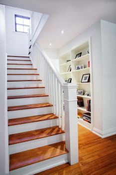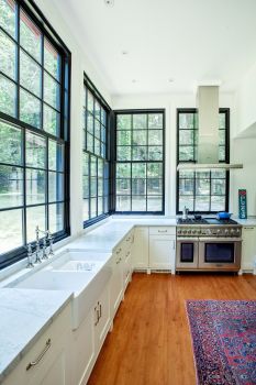 We added a new Screened Porch to the front of the house, and a cedar shingle attached garage. To the rear, we devised a new single-storey Kitchen addition, sited to gain the best possible views out over the grounds. Smaller rooms were ganged together to make larger spaces. All windows were replaced, and several new openings were created both for views and for access to the gardens. Our goal was to open all rooms to behold what was a remarkable arboretum. Our vantage point was an interior that was sparsely furnished and dazzlingly white, the best way to show the original brick, stone and maple.