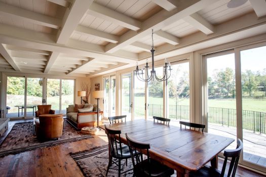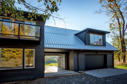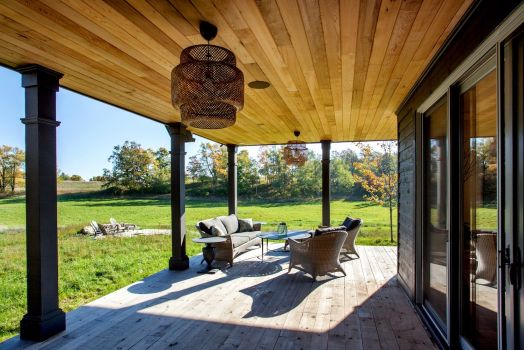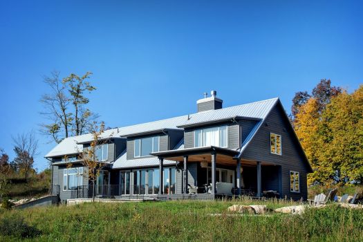 Arriving at the house, you approach a breezeway and, entering it, you see the meadow framed beyond. The breezeway gives onto a concrete plinth that provides a stunning vista of lush Ontario farmland. Likewise, the principal interior spaces are tuned to the pastoral views of the site with a series of projecting bays and dormers.