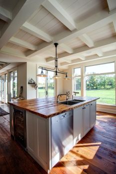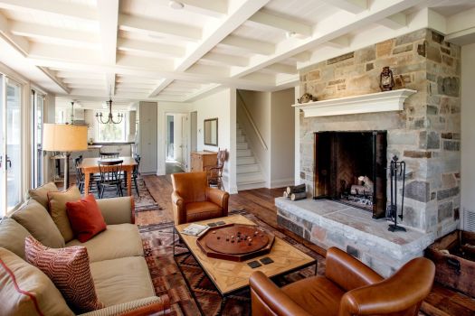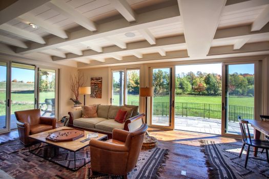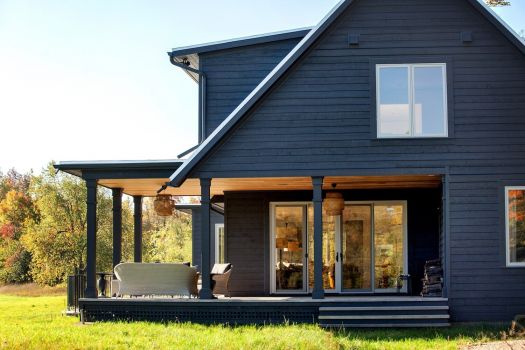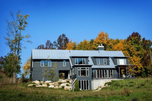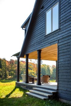 As an exercise in sustainability, the house is built from local, natural materials: wood siding, a standing seam metal roof and salvaged hemlock floors. Its super-insulated envelope is easily heated and cooled with an efficient mechanical system. The basement is recessed into the hillside, with a walkout on that level for access to skiing and hiking. A veranda anchors the quiet end of the main floor, beyond a stone terrace onto which the living room opens.