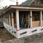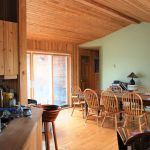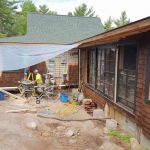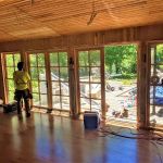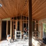 The work started by gutting the “Box”. The ceiling panelling could be salvaged, but not much else. The sliding doors were to be replaced by tall windows and french doors. New interior pine panelling would clad the walls. On the outside, all sides of the cottage received new cedar shingle siding.