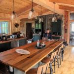 In the renovated Kitchen, an Island made from salvaged hemlock was placed beneath a muscular beamed ceiling. All wood and stone were sourced locally, and crafted expertly under the aegis of the general contractor, Andrew Ashcroft.