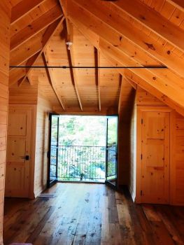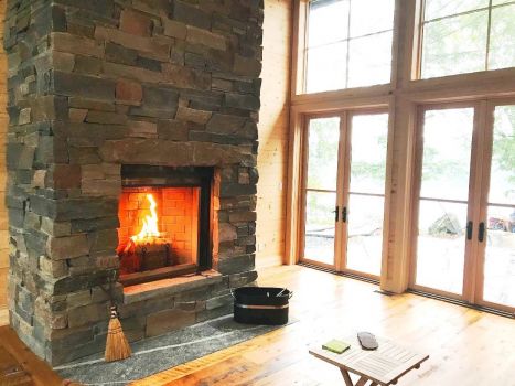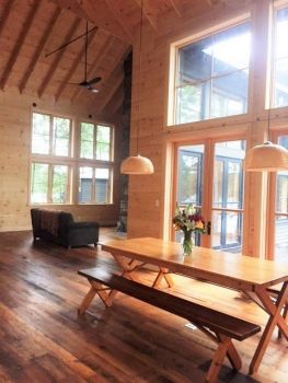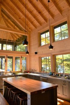 Work is still in progress. We now have a weathertight, 4-seasons building with electricity, good water and a new septic. A metal roof will last several more generations, and beneath it, a double-height Living Room will host family and friends who can warm themselves before a massive granite fireplace. Wood cladding on the interior has been supplemented by material salvaged from the old cottage, in the form of old growth Fir wood flooring, now integrated as ceiling paneling in the bedrooms. All is done in a simple and uncluttered way.