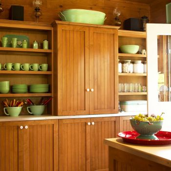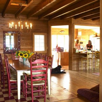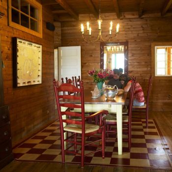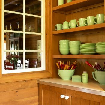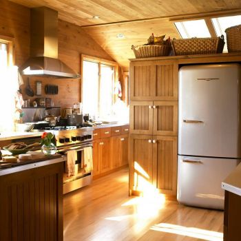 The kitchen in the old cottage was completely demolished and renovated. We designed new cabinets to blend in with the century-old wood walls. A retro-style refrigerator hides the washer and dryer beyond. We doubled the number of windows to take advantage of the many good views of the landscape.