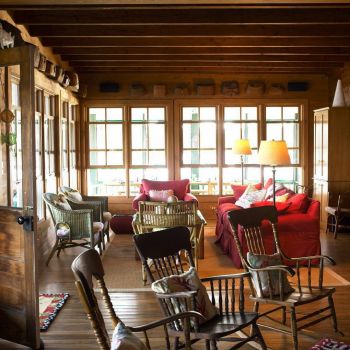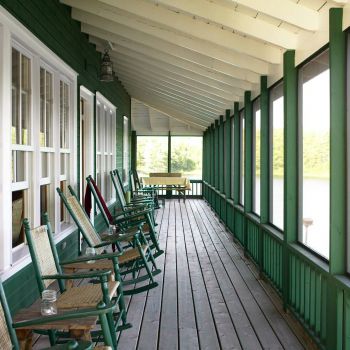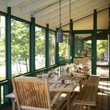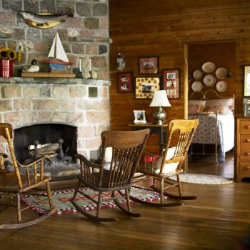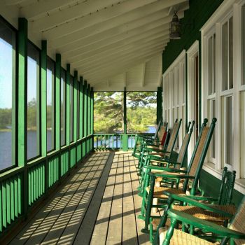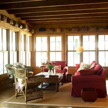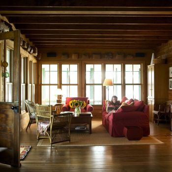 An example of our capacity to re-new a building is the Long Verandah, a favourite family space. New floor-to-ceiling screening faces the water from 3 sides of the cottage. The rocking chairs sit on a solid cedar plank floor supported on new structure. New windows into the Living Room bring sunlight deep into the cottage.