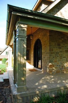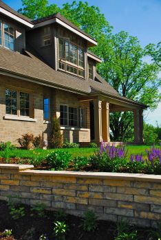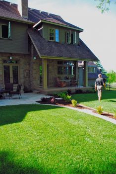 A palette of materials and forms evolved based on the vernacular elements of Halton Hills, namely rough-dressed stone, wood siding and a steeply-pitched roofline to overhang the verandah. Dormers punctuate the roof, and all windows in the home can open to provide natural ventilation. A home office was designed for above the attached garage. Inside, a woodburning fireplace acts as a divider between the Living Room and Dining Room. Ceilings are high, and the simple finishes of walls and ceilings set off the hardwood plank flooring.