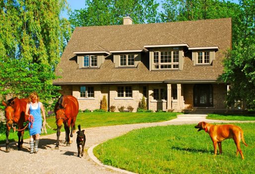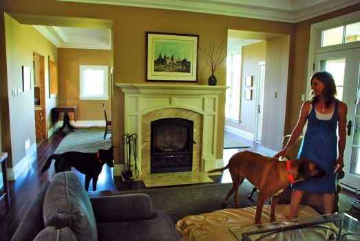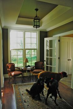Planning the new home rose out of several interests: that the house would sit on a low rise, hidden from the sideroad; that the main rooms on the ground floor all had doors opening to the garden; that a veranda and a screened porch might offer comfort when sitting outside; and that, of the many good views available to the house interior, a clear sightline was made from the Kitchen back to the stables from which the horses could see their owners. Window sills too were made sufficiently low that the resident dogs could look out on the landscape.