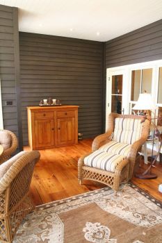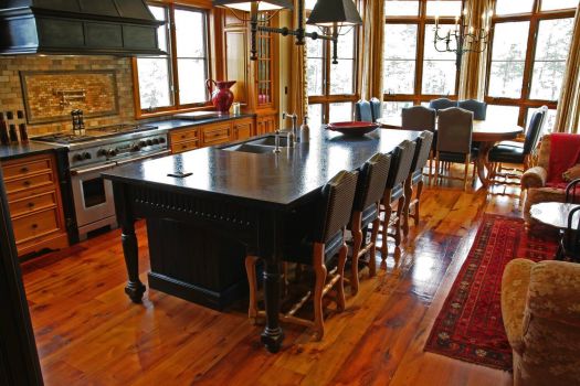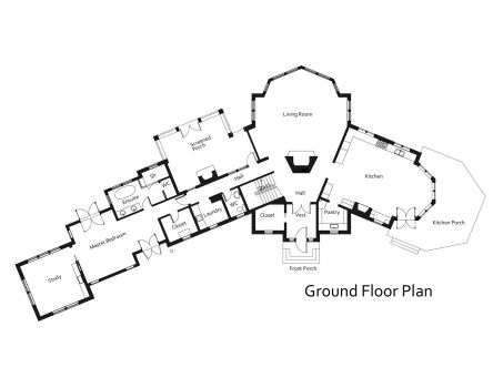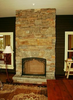 The Owner’s vision was of a home that felt like a lodge — wood panelling, rough stone fireplace masonry, hemlock floors, and deep overhanging eaves. Working with the landscape, we developed a butterfly plan that incorporated the Living Room at the plan’s hub, with a kitchen wing to one side of it, and the Screened Porch, Master Suite and Office to the other side. The wings are angled symmetrically around the front entrance, which features a circular stone plaza.