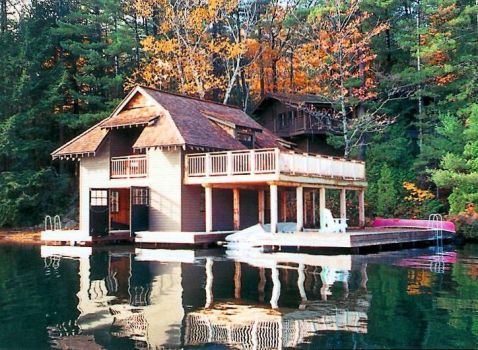 The broad dock that wraps around the boathouse supports an upper deck. Upstairs, the Living Room opens onto the deck through a pair of French doors.
