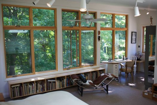 By peeling off the roof and blowing out the garden front, we were able to top up the house with a new Master Bedroom floor, extend a new kitchen to the south, and to add floor-to-ceiling windows at each level to behold the valley panorama. Open decks at the 2nd floor and off the kitchen are made private through the use of translucent polycarbonate paneling, and the building cladding is a traditional Fifties vertical wood siding. Installing heavier insulation around the building envelope, providing natural cooling via windows and skylights, and the deliberate emphasis placed on natural lighting are the means we put in place to completely transform the energy footprint of the home. And to their credit, the Owners worked tirelessly to perfect the early modern details of the building, ranging from the sourcing of period lights to installing the scrollwork-style address number fronting the street.